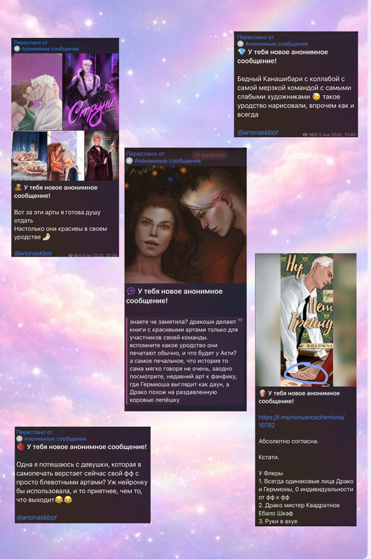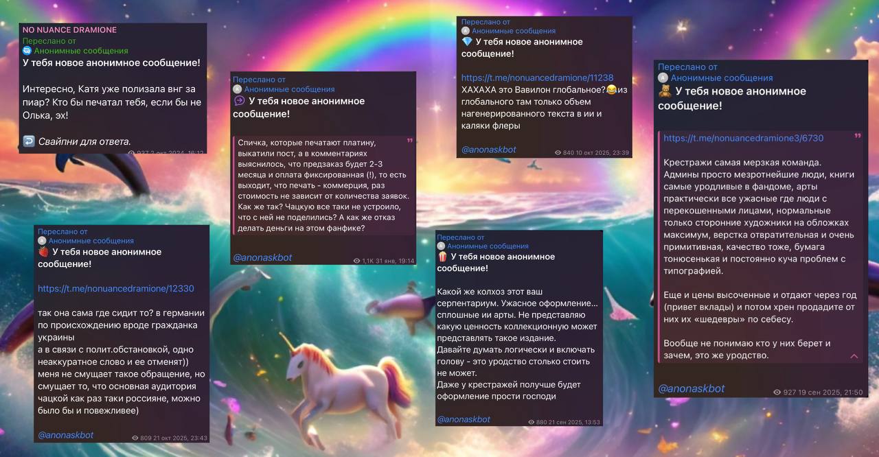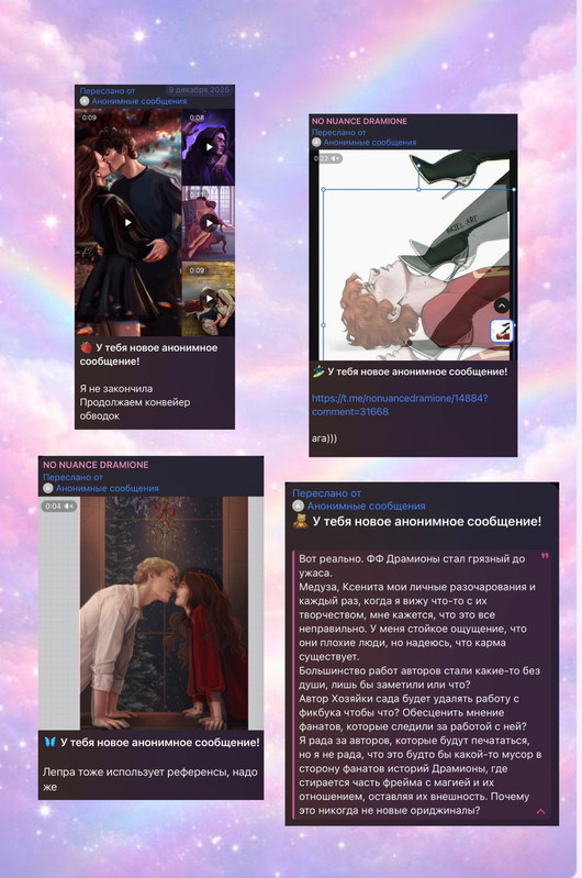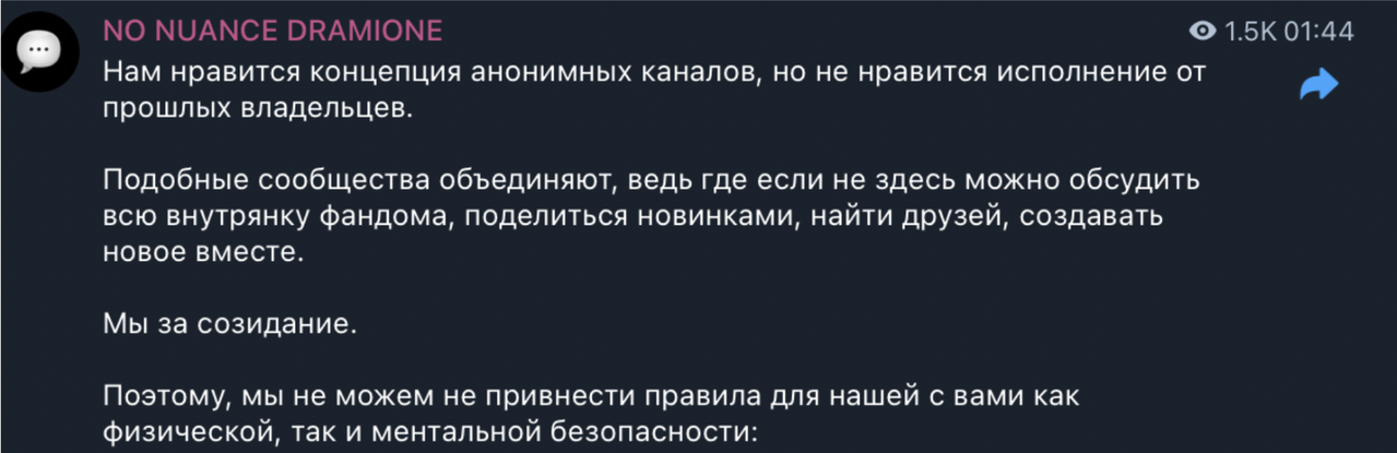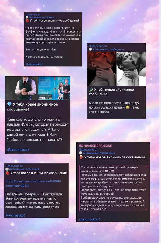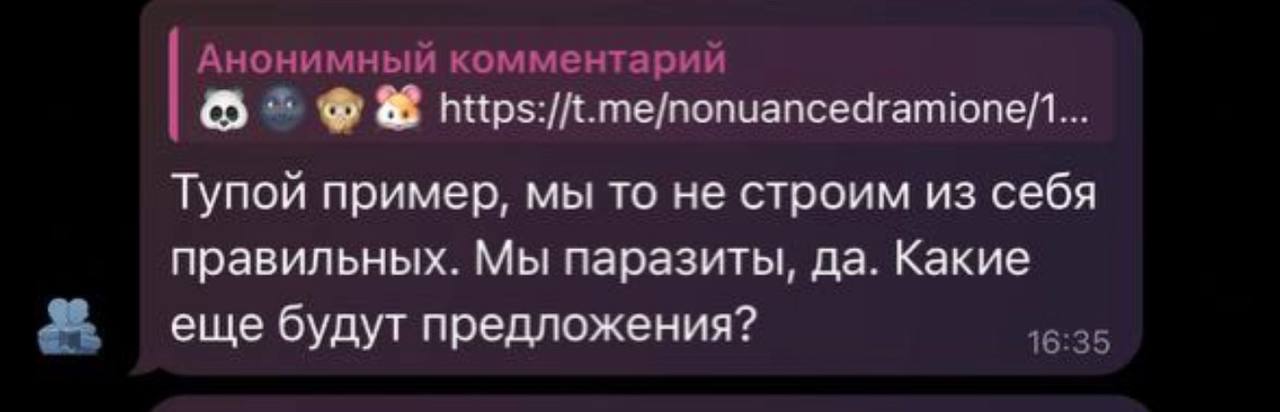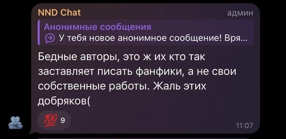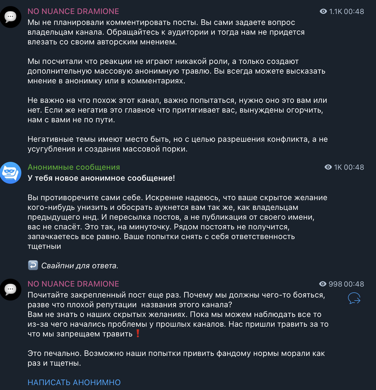 Рыться в выгребных ямах, как вы уже успели понять, это давняя забава фандома драмионы: люди, ведомые порывом восстановить НРАВСТВЕННОСТЬ, МОРАЛЬНЫЕ УСТОИ общества и просто НЕСТИ СВЕТ, у нас почему-то не жертвуют на благотворительность, не участвуют в инициативах по уборке города и не примыкают к акциям помощи малоимущим, а все как один создают анонимные паблики – Сплетницы (которыми, как всем известно, был Женя, но мы провели с ним воспитательную беседу и отобрали телеграм-каналы), ННД и Подслушки, в которых норма на количество света в постах напрямую зависит от количества серого вещества в голове у среднего подписчика, так что кончается довольно быстро. И так как обычно без анонимной плашки языки у всех в жопе, то появляется отчетливый душок говна.