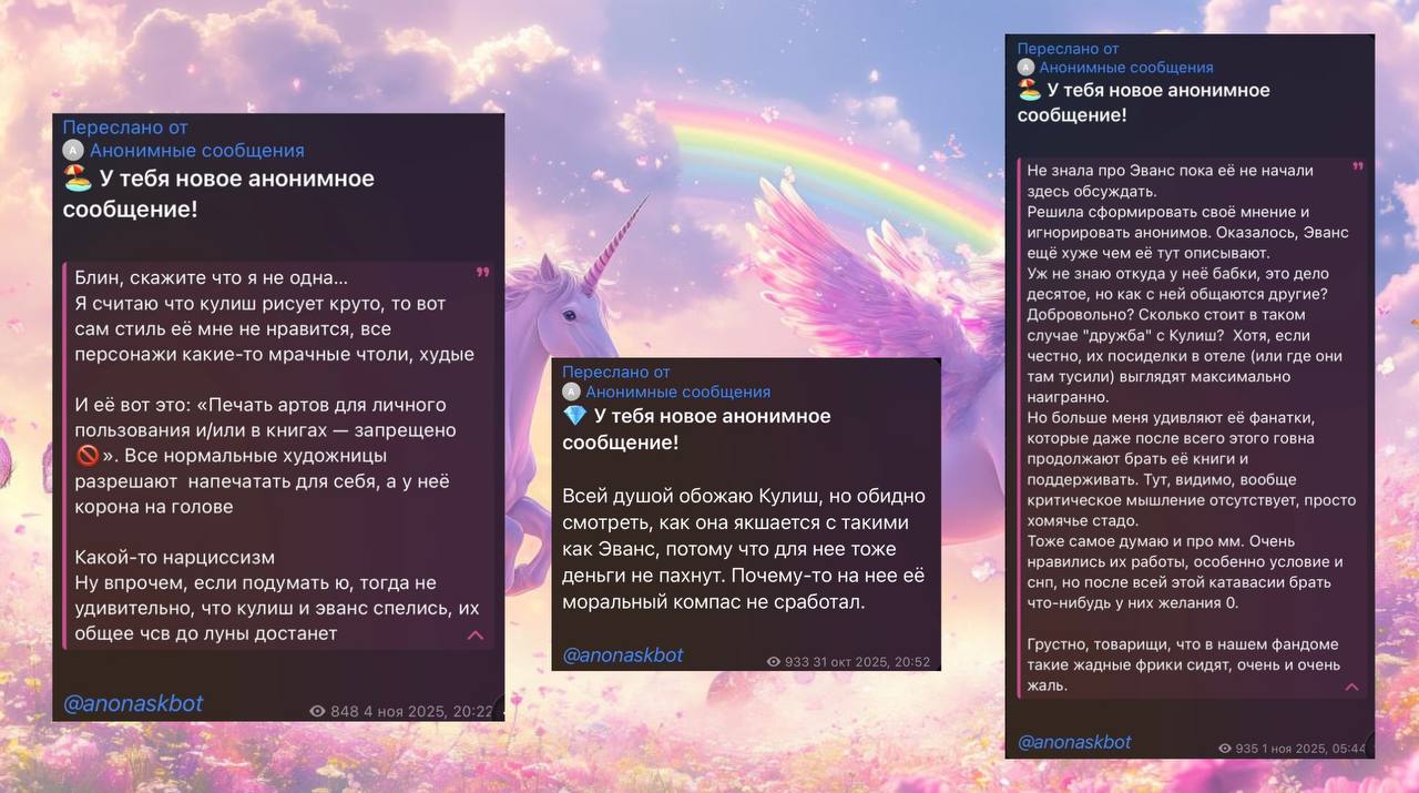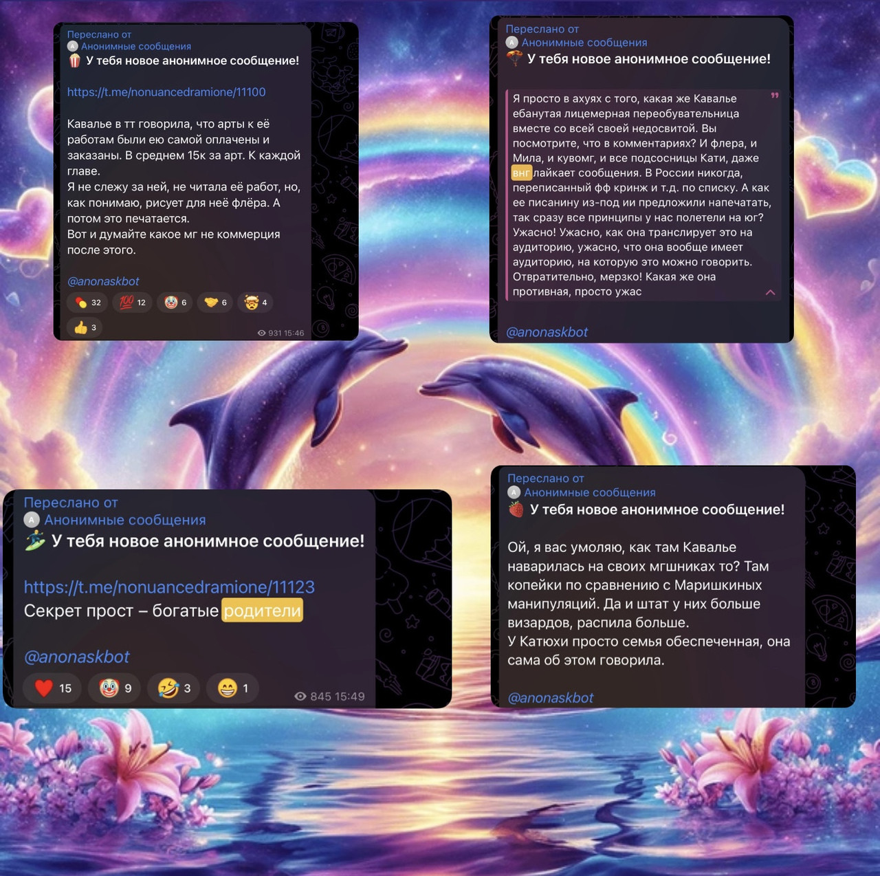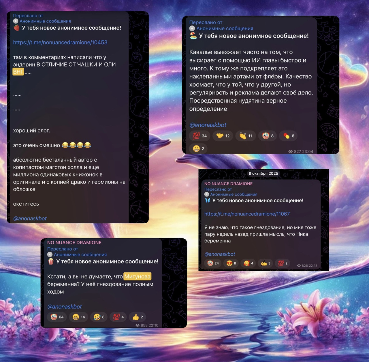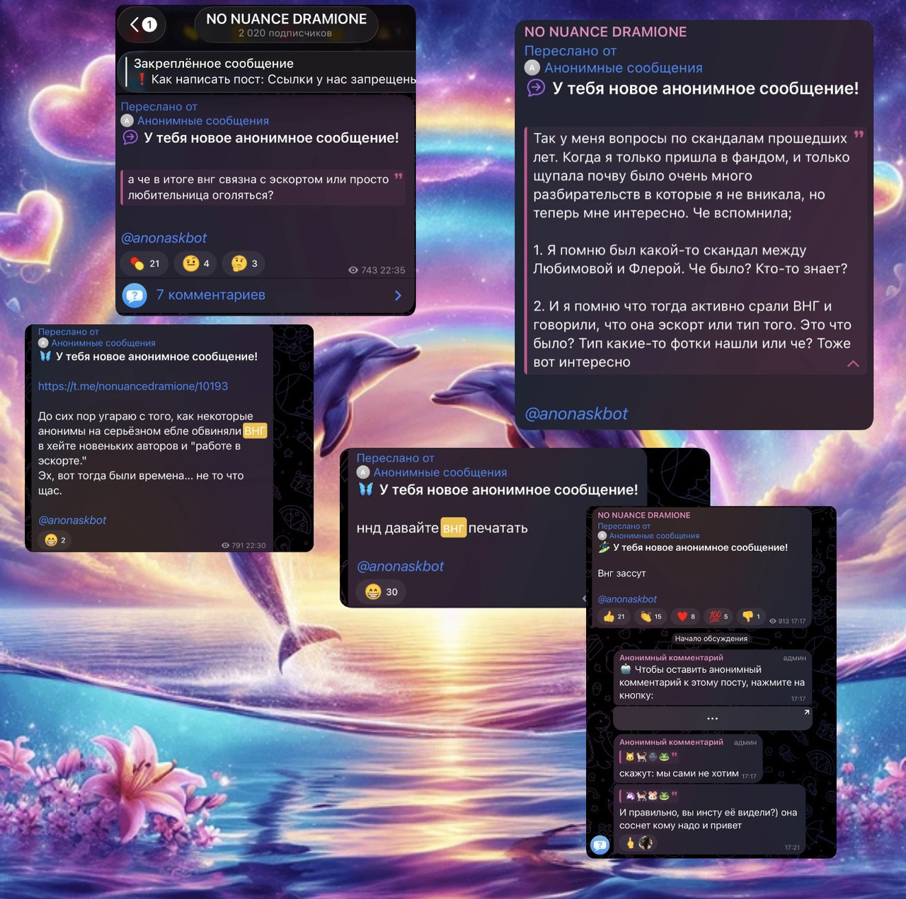 Рыться в выгребных ямах, как вы уже успели понять, это давняя забава фандома драмионы: люди, ведомые порывом восстановить НРАВСТВЕННОСТЬ, МОРАЛЬНЫЕ УСТОИ общества и просто НЕСТИ СВЕТ, у нас почему-то не жертвуют на благотворительность, не участвуют в инициативах по уборке города и не примыкают к акциям помощи малоимущим, а все как один создают анонимные паблики – Сплетницы (которыми, как всем известно, был Женя, но мы провели с ним воспитательную беседу и отобрали телеграм-каналы), ННД и Подслушки, в которых норма на количество света в постах напрямую зависит от количества серого вещества в голове у среднего подписчика, так что кончается довольно быстро. И так как обычно без анонимной плашки языки у всех в жопе, то появляется отчетливый душок говна.