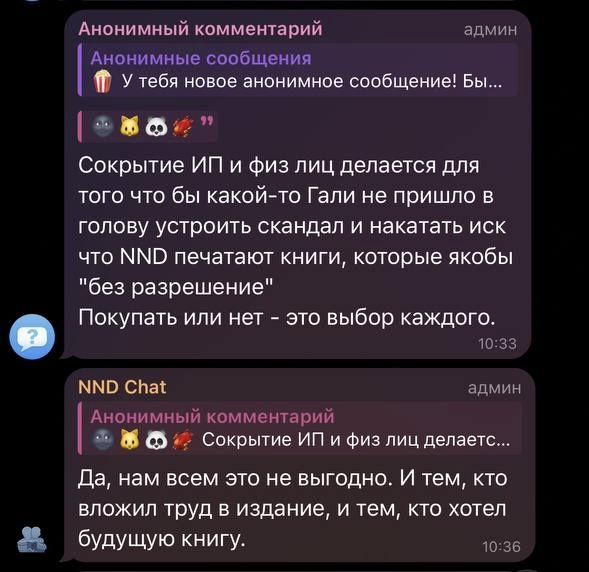 ННД анонсируют печать фанфика без разрешения автора, выкладывают скрины с запросом стоимости тиража работы ЛВВЗА в издательстве “Грифон” и обсираются, как обычно, со всем, даже с замазыванием имени на скрине, где остаются видны кусочки букв, по которым настоящим детективам не составляет труда подобрать подходящее имя.