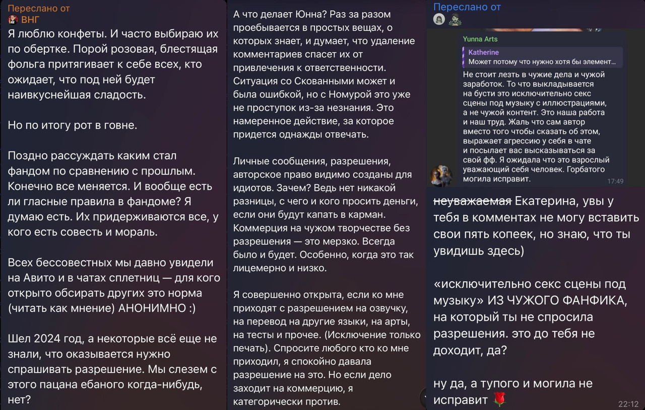 Катя уже однажды взяла сцену из “Номуры”, автор которой не давала ей разрешение на использование и тем более монетизацию созданного ею контента, и залила ее на свой платный канал. Точно так же как сейчас, неся ерестический бред о том, что «это просто секс-сцена с музыкой»🤡, опуская факт того, что это секс-сцена, написанная не ее рукой, и указывая не лезть в “чужой заработок”)) как удобно))