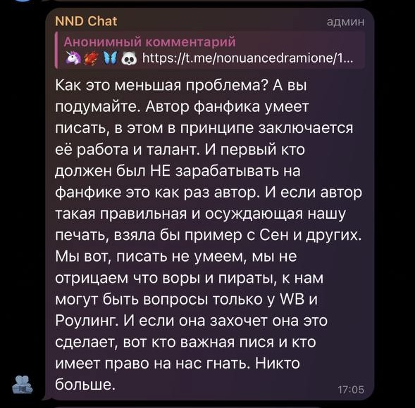 И такой вот любитель ✨прекрасного✨ не просто создает место, где можно толпой созидать в несколько стволов неугодных деятелей фандома, но еще и печатать фанфики, разрешения на которые никто не давал: ни авторы, ни переводчики. Более того, команда ННД (сразу спойлер: там из команды ООО Биба и Боба) планирует 🤡мерч🤡
