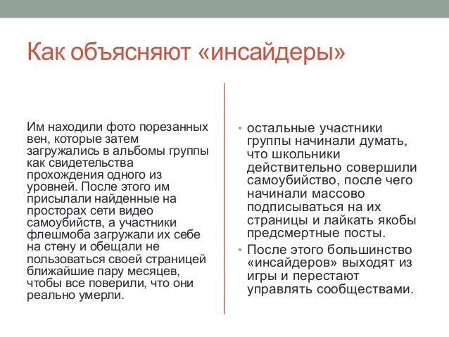 Им находили фото порезанных вен, которые затем загружались в альбомы группы как свидетельства прохождения одного из уровней . После этого им присылали найденные на просторах сети видео . . .
