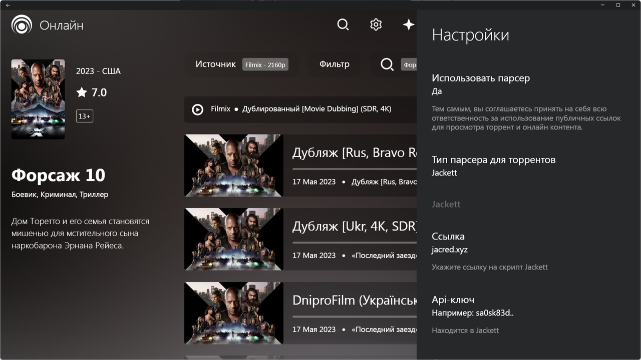 Парсер Jackett это приложение которое находит торренты по всем сайтам. Настройки - Парсер - Использовать парсер, ставим Да. В поле Тип парсера для торрентов выбираем jackett. В поле Ссылка указываем адрес и если нужно Api-ключ.