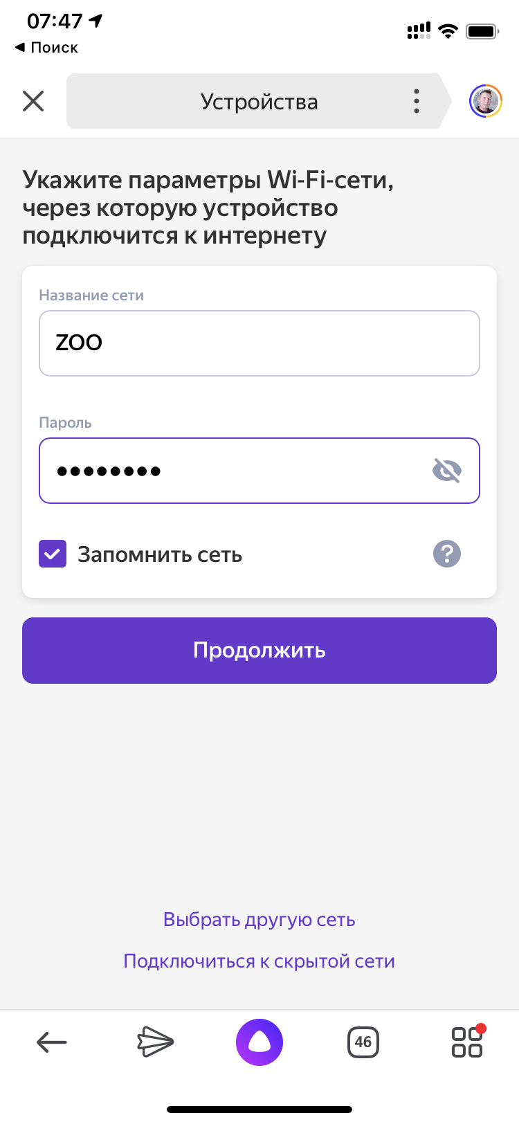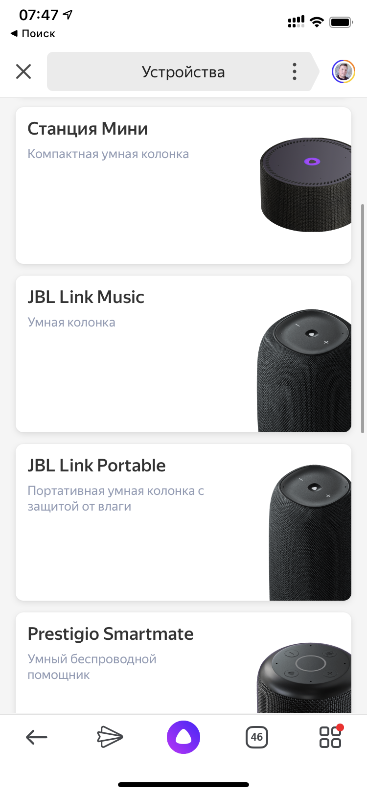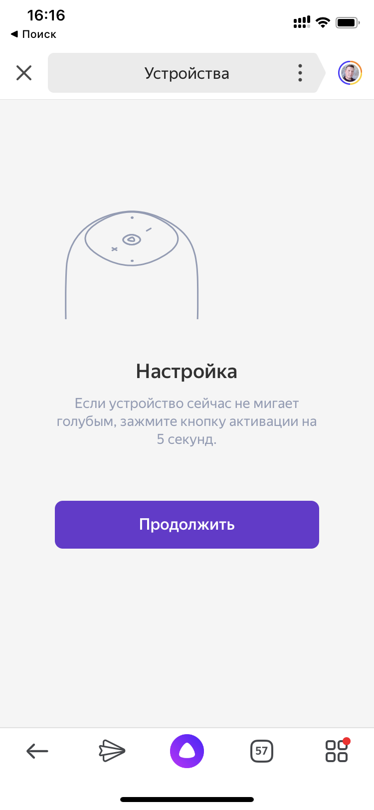 Откройте раздел «Устройства», выберите там свою умную колонку и нажмите кнопку «Подключить» . Если станция была выключена, включите ее и нажмите кнопку «Продолжить» .