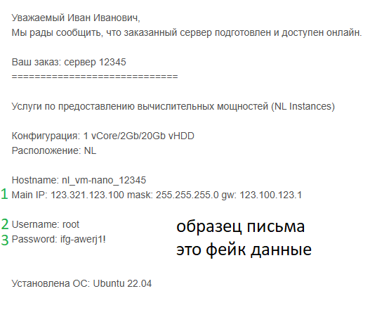 Важно! Выбираем обязательно Операционная система(ОС) - Ubuntu 22.04 Остальное не меняем, оставляем как есть по стандарту. Нажимаю Заказать. Оплачиваем любыми доступными способами, я оплачу по СБП. После оплаты ждем уведомления на емайл, ожидать нужно примерно 10-30 мин готовности сервера. Приходит письмо от хостинга что сервер подготовлен и онлайн.