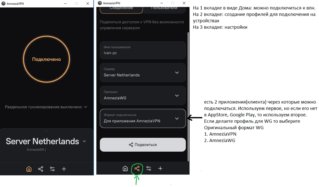 Для того чтобы подключаться к впн на разных устройствах(пк, телефон, телевизор), нужно создать новый профиль, нажимаем внизу на 2 вкладку, Соединение, пишем любое Имя пользователя(название профиля), формат подключения оставляем как есть(если используете другой клиент на телефоне:AmneziaWG, то меняем на формат WG), нажимаем внизу Поделиться. Ждем пару минут, у вас появится QR-код для подключения, его можно использовать для быстрого подключения на телефонах (на телефоне открываете AmneziaVPN или AmneziaWG, выбираете Добавить сервер-Подключиться через QR, сканируете qr и ваш сервер добавится, и вы сможете в любой момент подключаться к впн). Нажимаем кнопку Поделиться, и тогда вы скачаете файл(конфиг) формата .vpn для подключения на пк/тв (Добавить сервер-Через файл, выбираете этот файл). Для корректной быстрой работы впн - используйте 1 профиль только на 1 устройство (например вы хотите впн на 2 телефона и 1 пк, значит у вас должно быть 3 профиля).