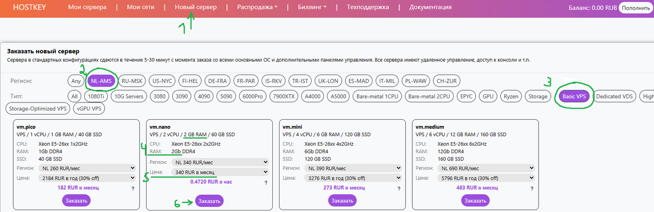 Открываем хостинг, регистрируемся, нажимаем 1.Новый сервер, нужно выбрать страну в котором будет сервер, я выбрал 2.NL-AMS (это Netherlands Amsterdam, европейская страна Нидерланды), не выбирайте РФ(RU) потому что заблокированные сайты не будут открываться, не выбирайте США(US) высокий пинг из-за того что вы фактически находитесь далеко до Нью-Йорка и пакет интернета будет идти 400 мс вместо 150-200 мс, т.е. в 2-3 раза медленнее всё будет открываться, также большинство Пропов не работают с клиентами США и строго запрещают впн сша. Выбираем 3.Basic VPS чтобы отобразились только обычные впс. Минимальное количество RAM памяти не менее 1 GB, Рекомендуемое 2 GB. 4.Нахожу впс с 2 GB (vm.nano), 5.Нажимаю Цена и выбираю 1 мес за 340 руб. 6.Нажимаю Заказать