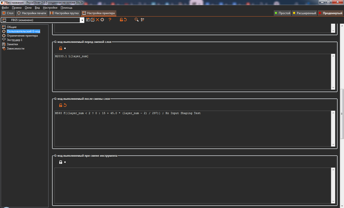 3. Зайти во вкладку Настройка принтера ->Пользовательский G-код ->G-код выполняемый после смены слоя и добавить туда строку :
