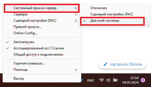 18. Сохраните конфигурацию и нажмите правой кнопкой на приложение в трее и выберите "Системный прокси сервер -> Для всей системы".