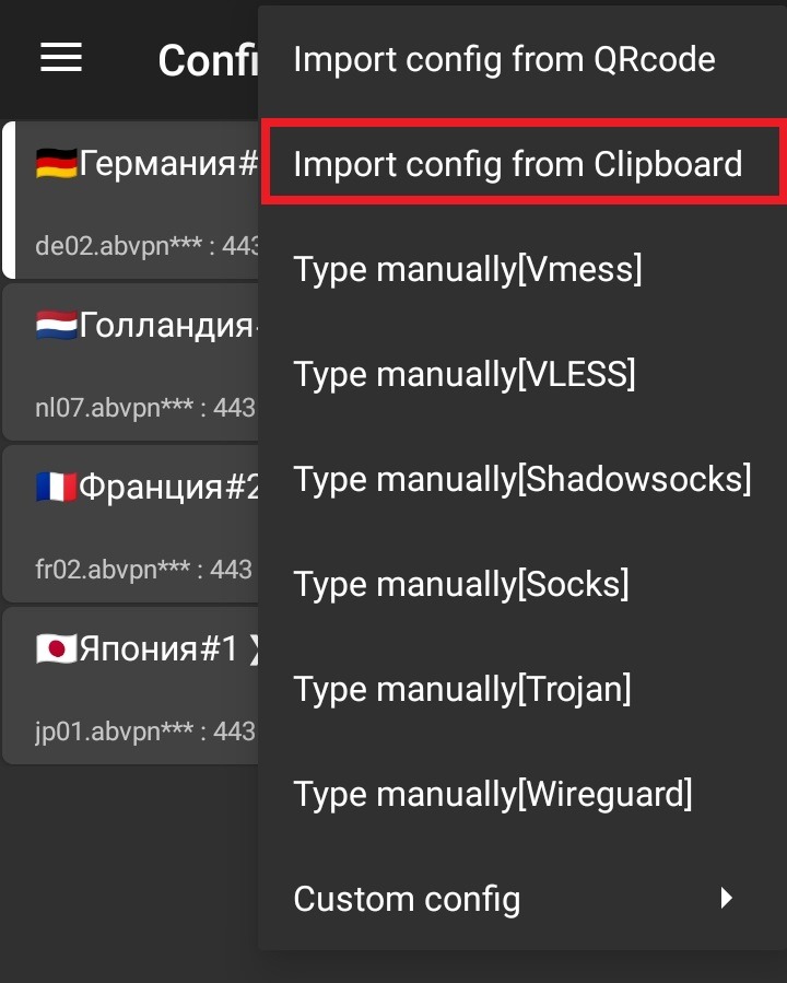 Открываем приложение v2rayNG, нажимаем + и Import config from Clipboard.