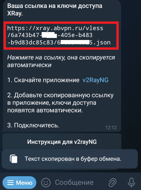 Копируем присланную ботом ссылку. Нужно просто нажать(тапнуть) на нее, ссылка скопируется автоматически.