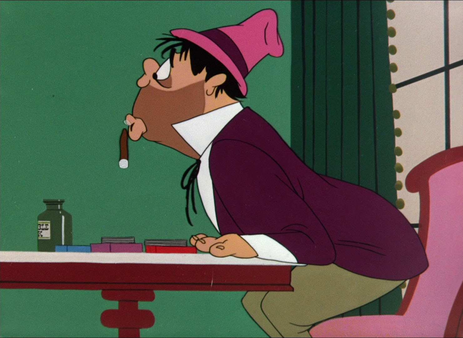 In "Barbary-Coast Bunny", a rather different version of Nasty Canasta—now with a dopier look complete with pudgy lips and crooked teeth (and voiced not by Mel Blanc or John T. Smith, but by Daws Butler)--steals gold from Bugs Bunny. That prompts Bugs to say: "You do realize that it is not going to go unchallenged." Six months later Nasty Canasta uses the ill-gotten gold to erect a rigged casino. Bugs is disguised as a rube and appears to believe that a slot machine is a "tele-o-phone." He asks his mom for more money. The machine rings up a jackpot and a barrel of money comes out, to Canasta's shock. Bugs says: "Gee, thanks Mom" and wheels away his winnings in his bag. Seeing this, Nasty challenges Bugs to a series of crooked card games such as blackjack in hopes of parting Bugs from his winnings. Bugs continuously (though seemingly naively) defeats him. Nasty Canasta also rigs a roulette wheel, but it somehow fails when Bugs decided to play number 23 and wins; in the last round Nasty almost wins when the ball lands on a different number than 23 - which Nasty had blocked; however Nasty thinking he wins hits the table so hard that the ball lands in 23. Bugs ultimately gets revenge by rendering Canasta flat broke. Nasty tries to rob Bugs - who spins the pistol which shoots coins. Nasty tries to spin coins from the gun as well - and gets blasted.