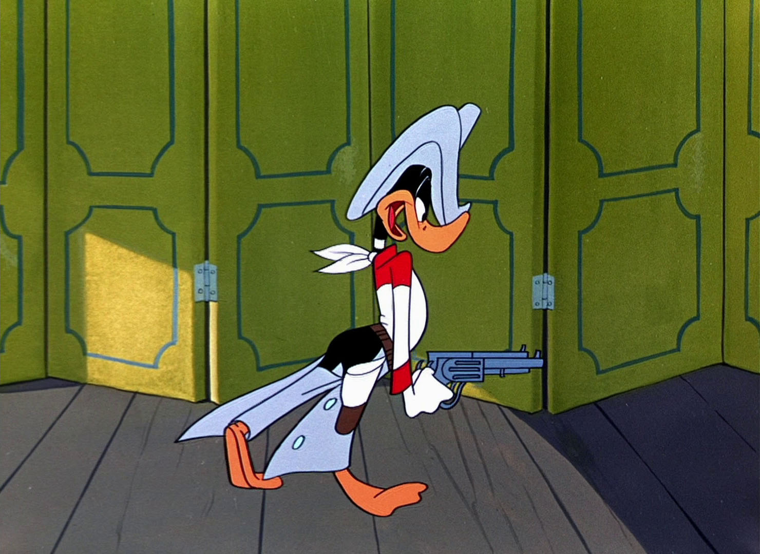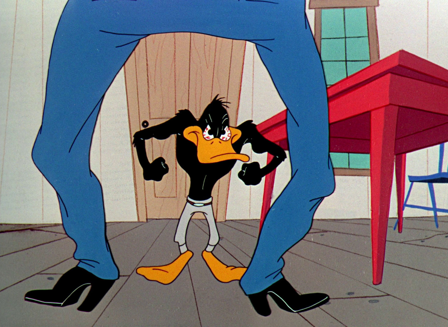 Canasta returns in "My Little Duckaroo". When we first see Nasty Canasta he is sitting peacefully at a table playing cards. Upon proclaiming himself the Masked Avenger, Daffy fails to grab the attention of Canasta (stating "Didn't you hear me, I said I was the Masked Avenger. Look, see my mask? It's a very nice mask."), who still sits peacefully at his table dealing cards. Daffy then vies for the attention of Canasta, leaving the scene and returning first as the whip-wielding (and stereotypically Mexican) "Frisco Kid", then in a suit reminiscent of Superman's as "Superguy." Again failing to grab his attention, Daffy suggests other identities he could take, names parodying heroes of the time ("Captain Hideo? The Green Fathom? Mark of Zero?"), but none interest Canasta. He finally grabs the attention of Canasta after offering a helpful suggestion to his card game ("Say, why don't you play your red jack on the black queen?"). Challenged to play cards, Daffy departs and returns in new cowboy garb (but sans mask), confident of victory. What follows is the humiliation of Daffy again and again through different gags and challenges. First Daffy is asked if he plays cards, to which the game is ended abruptly when Canasta cuts the deck with a meat cleaver. Canasta then sends Daffy through the table in response to Daffy's challenge to an arm wrestling match, to which Daffy responds, 'I think you're pretty tough, don't I?'. Porky then suggests to Daffy that he should just arrest him, to which Daffy agrees ('well, you may have something there comedy relief'). But when Daffy puts Canasta in irons and tries to take him away, he finds that he can't move Canasta from the spot he is standing. Daffy then gets annoyed and angry, to which he responds by telling Canasta that he is going to give him a fist beating. Porky's encouragement of Daffy ('telling him to fix Canasta's little red wagon') only ends badly for Daffy, as we see Canasta rip his shirt right off just by flexing his muscles before beating up Daffy, who staggers away broken and defeated, describing Canasta's little red wagon's condition in terms like it was literally a child's broken down toy and announces that he's now going home to mother, before collapsing.