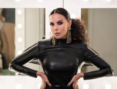 Черная шнуровка и откровенное декольте сделали акцент на фигуре звезды . Настя Каменских соединила контрастный наряд с лаконичными черными босоножками на высоком каблуке .