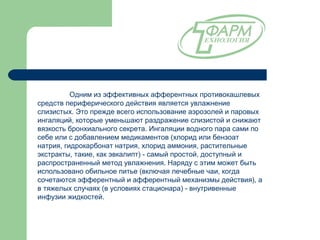 Противокашлевые средства периферического действия влияют на чувствительные окончания в слизистой оболочке дыхательных путей . Они оказывают смягчающее и местноанестезирующее действие, уменьшая поступление "кашлевых стимулов" из гортани, трахеи и бронхов . Типичным примером такого лекарства является ацетиламинонитропропоксибензен .