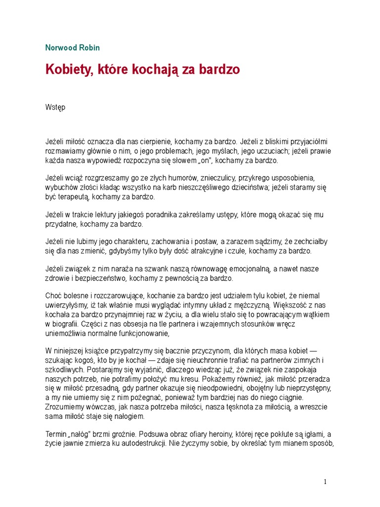 Norwood Robin Kobiety, które kochają za bardzo Wstęp Jeżeli miłość oznacza dla nas cierpienie, kochamy za bardzo . Jeżeli z bliskimi przyjaciółmi rozmawiamy głównie o nim, o jego problemach, jego myślach, jego uczuciach; jeżeli prawie każda nasza wypowiedź rozpoczyna się słowem „on", kochamy za bardzo .