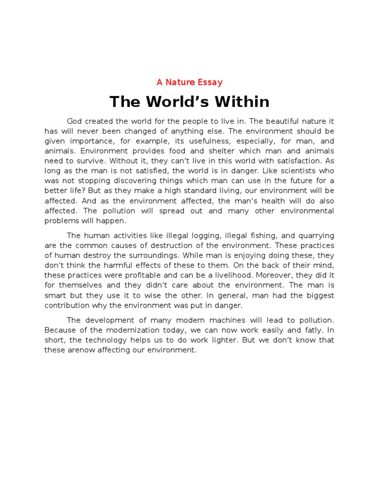 These essays are descriptive, simple easy, pdf download, literary, persuasive style for children and students of Ukg kids, class 1,2,3,4,5,6,7,9,10th and college level students . Essay on Nature ; Role and Importance with Need of Nature Conservation in Life . The presence of beautiful and attractive environment around us is called nature .
