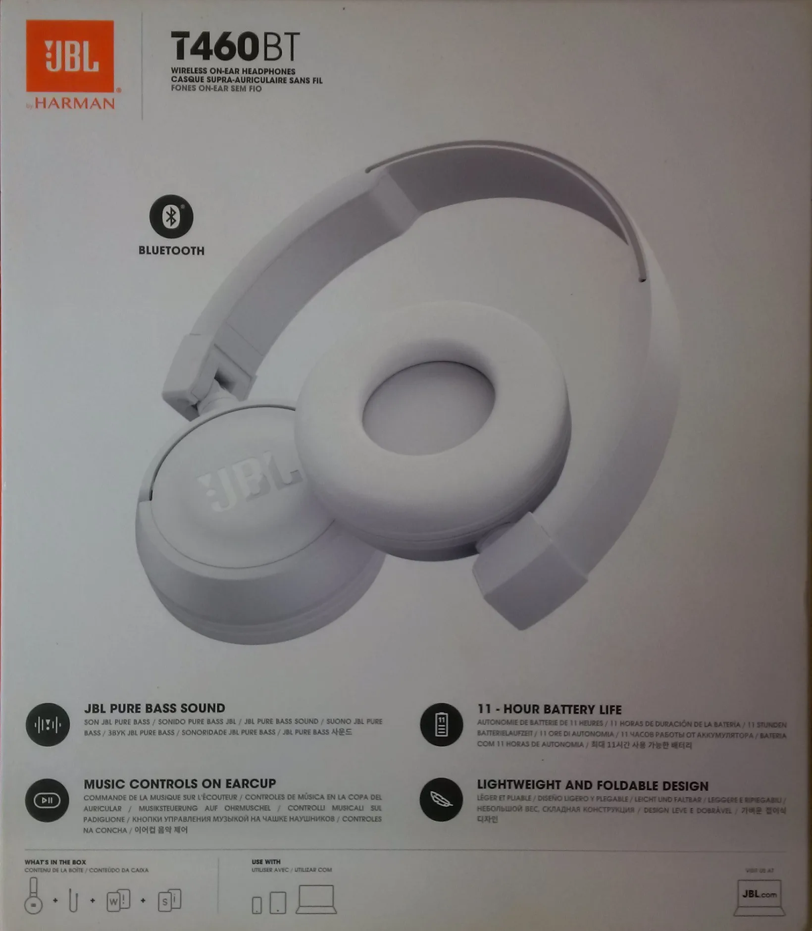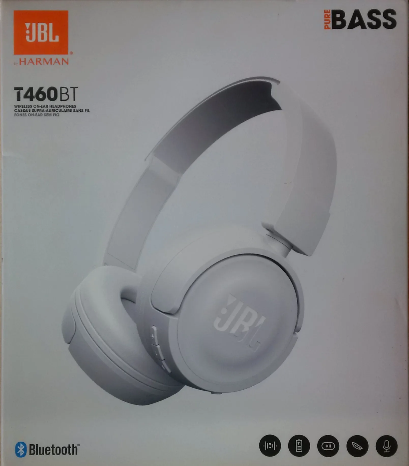 Introducing JBL T460BT on-ear wireless headphones . They're flat-folding, lightweight, comfortable and compact . Under the hood, a pair of 32mm drivers punch out some serious bass, reproducing the powerful JBL Pure Bass sound you've experienced in much bigger venues . Music and call controls/microphone are placed on the earcup .