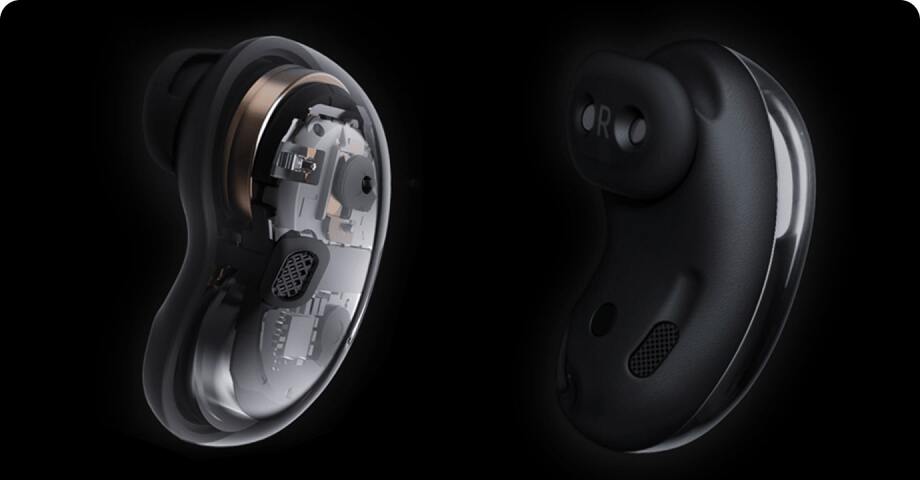 Как правильно носить Galaxy Buds Live ? The Galaxy Buds Live cradle in Mystic Bronze . It spins and opens and the earbuds float out of the cradle . They are seen from the inner side to show the location of the L and R on the eartips . The left earbud shifts slightly and sound waves come out of the bottom of the bud .