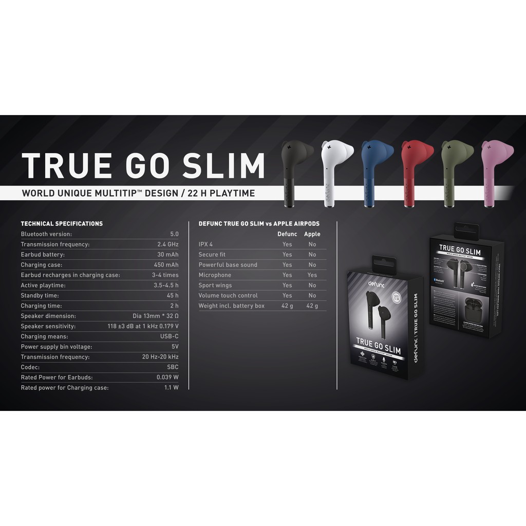 The Defunc TRUE GO SLIM , the little brother of Defunc TRUE GO , provides a seamless sound and communication experience in a small size . The earbuds feature our world-unique, self-developed, consumer insight-based MultiTip™ design, to ensure long-lasting comfort . Sport wings included! Features: 22 h playtime with chargin
