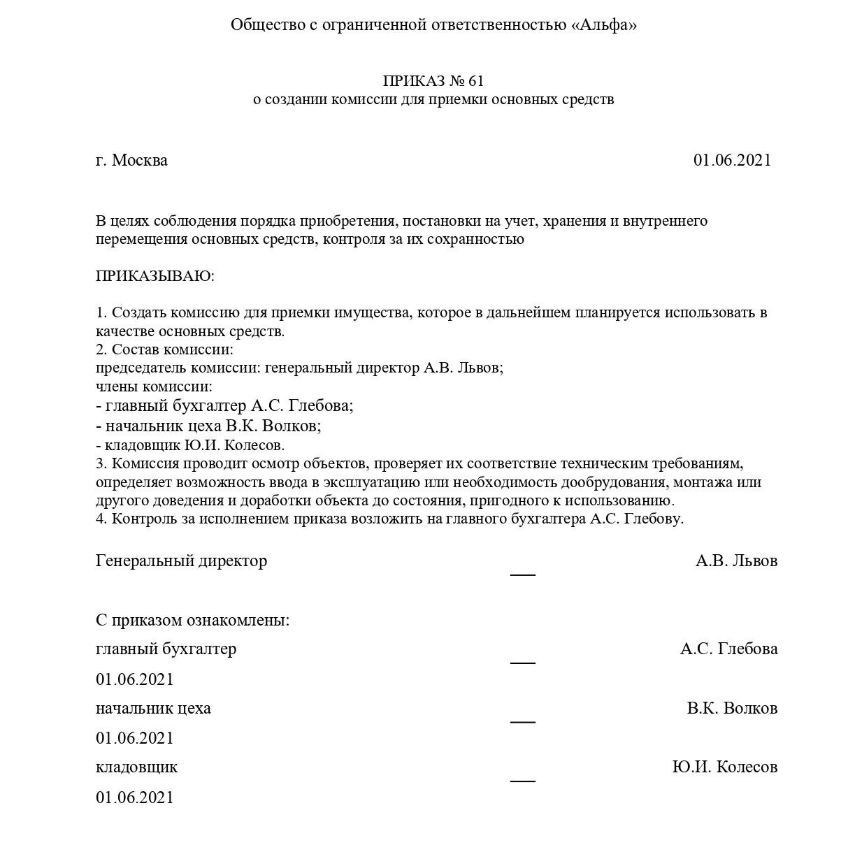Назначить приемочную комиссию