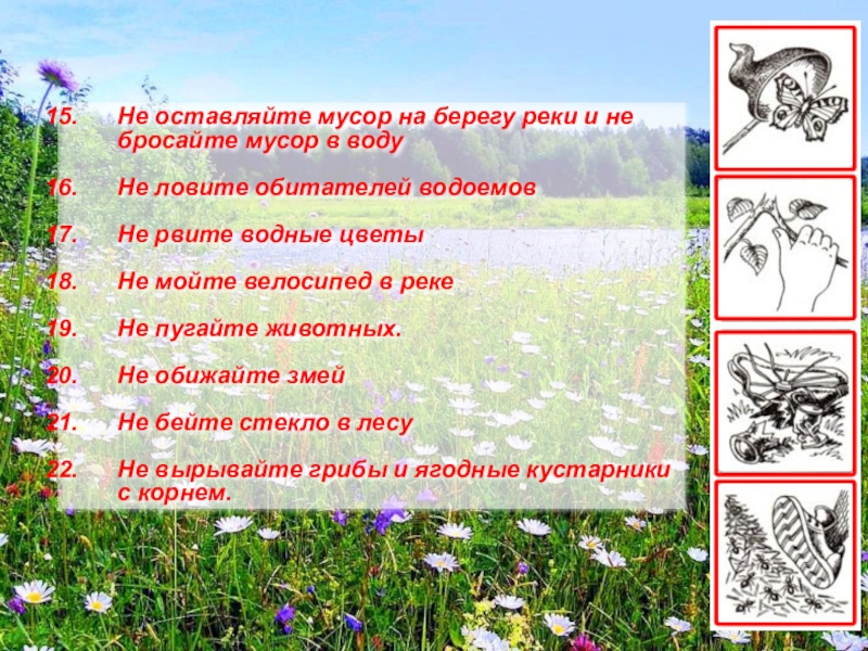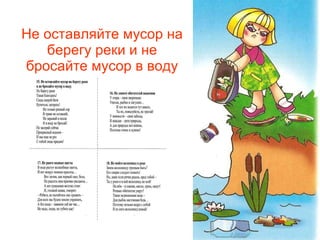 Не оставляйте мусор на берегу реки и не бросайте мусор в воду .» — Транскрипт: 1 Правила поведения у водоёмов . 2 Не оставляйте мусор на берегу реки и не бросайте мусор в воду