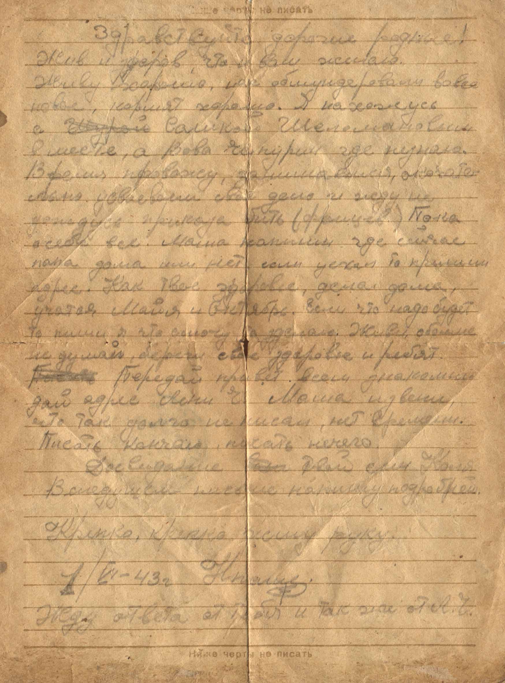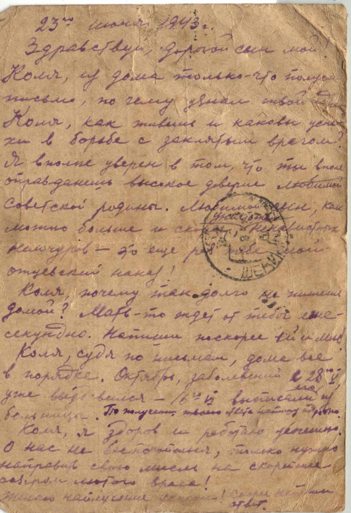 Коля, из дома только что получил письмо, по чему узнал твой адрес. Коля, как живешь и каковы успехи в борьбе с заклятым врагом? Я вполне уверен в том, что ты вполне оправдаешь высокое доверие любимой Советской родины. Любимый сын, как можно больше и скорее уничтожай ненавистных немчуров – это еще раз тебе мой отцовский наказ!