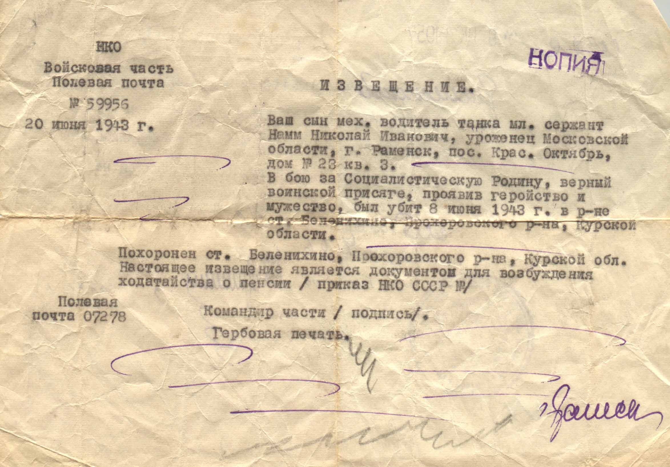 «Ваш сын, механик-водитель танка младший сержант Намм Николай Иванович, уроженец Московской области, г. Раменское, пос. Красный Октябрь, дом № 23, кв. 3 в бою за Социалистическую Родину, верный воинской присяге, проявив геройство и мужество, был убит…»