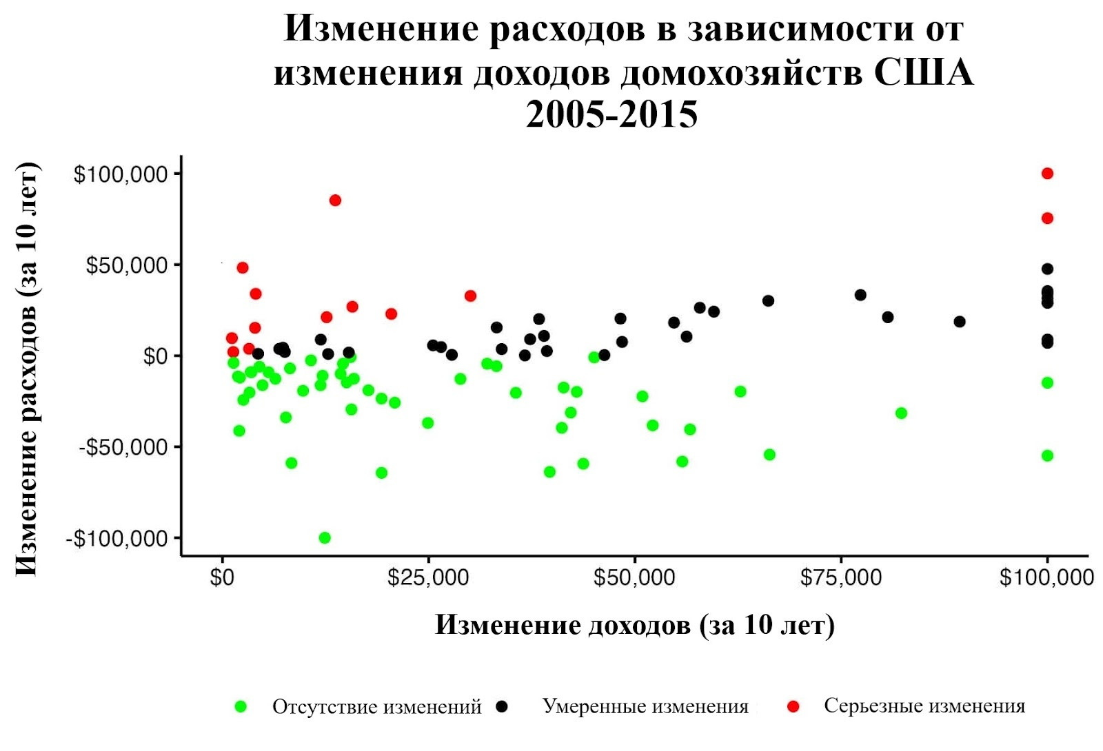 График одного из таких периодов представлен ниже. На нем изображены изменения в доходах (по оси X) и изменения в расходах (по оси Y) для всех домохозяйств, чей доход вырос за период с 1999 по 2009 год. В данных учтена инфляция. Кроме того, я разделил все домохозяйства на группы и выделил их цветом: “Отсутствие изменений” если их расходы уменьшились, “Умеренные изменения” если их расходы увеличись менее, чем на 75% от роста доходов, “Серьезные изменения” если их расходы увеличись более, чем на 75% от роста доходов.