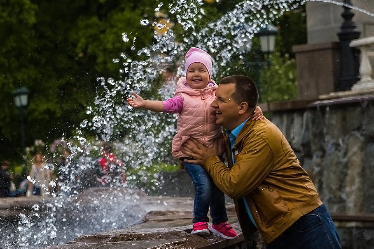 Солнце ещё светит, а подсветка уже всеми цветами радуги купает струи , капли, брызги в лучах солнца. Так радостно на душе! Забыла про возраст, не сдержала своих эмоций – подошла поближе, подняла голову навстречу влаге , .