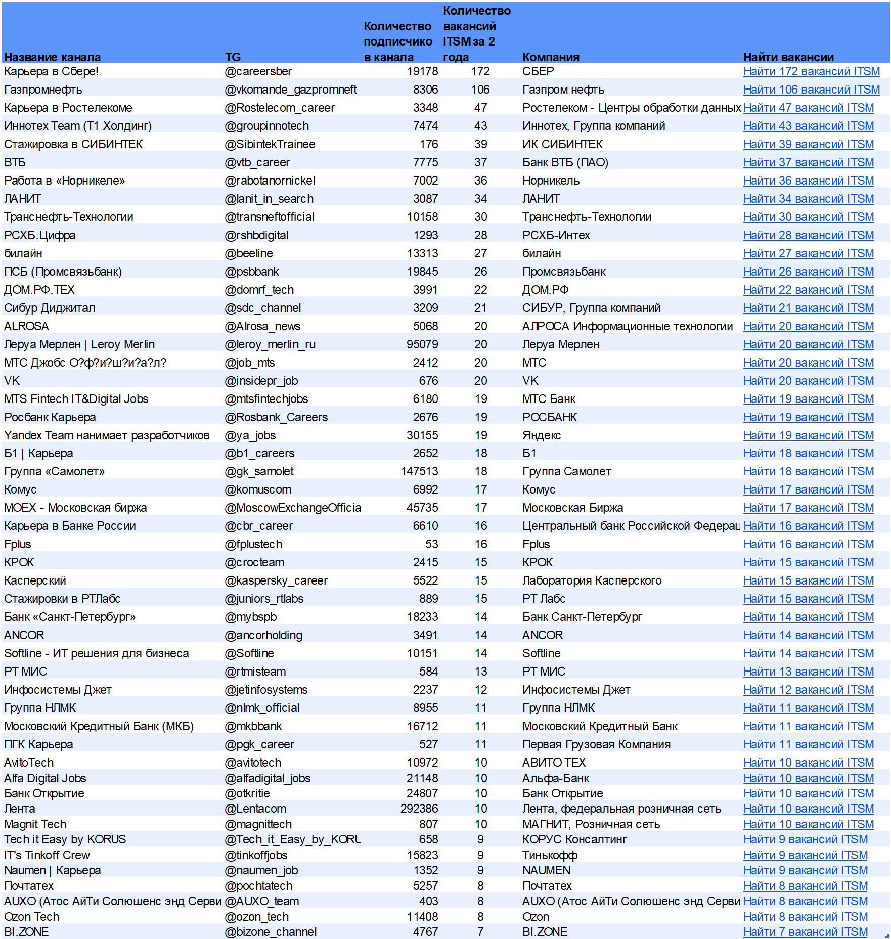 Полная версия таблицы содержащая более 100 телеграм-каналов доступна после подписки на телеграм-канал @ITSMJOB В полную версию входят также данные о карьерном сайте компании, сфера деятельности компании, группа в рейтинге работодателей России по версии РБК.