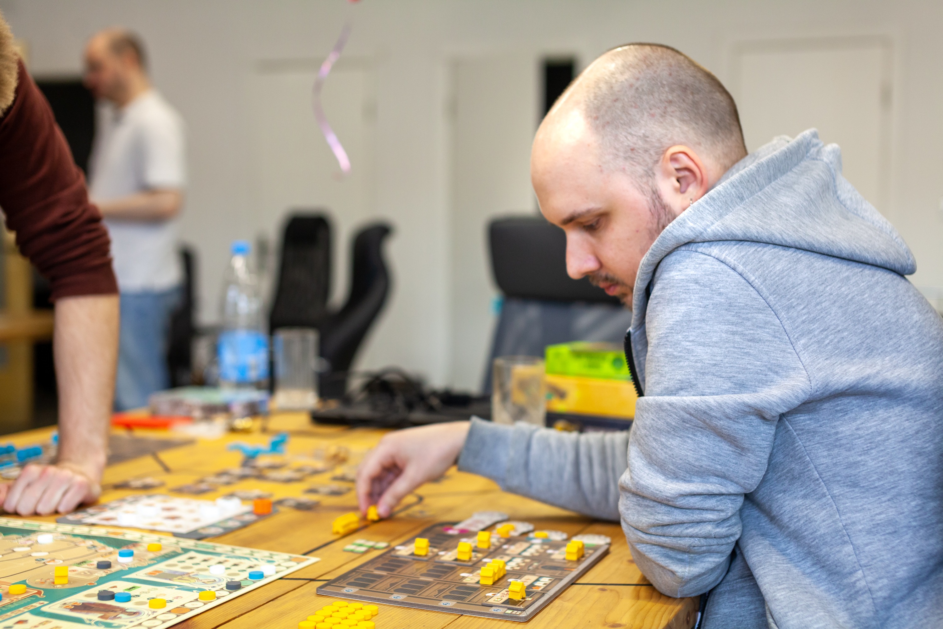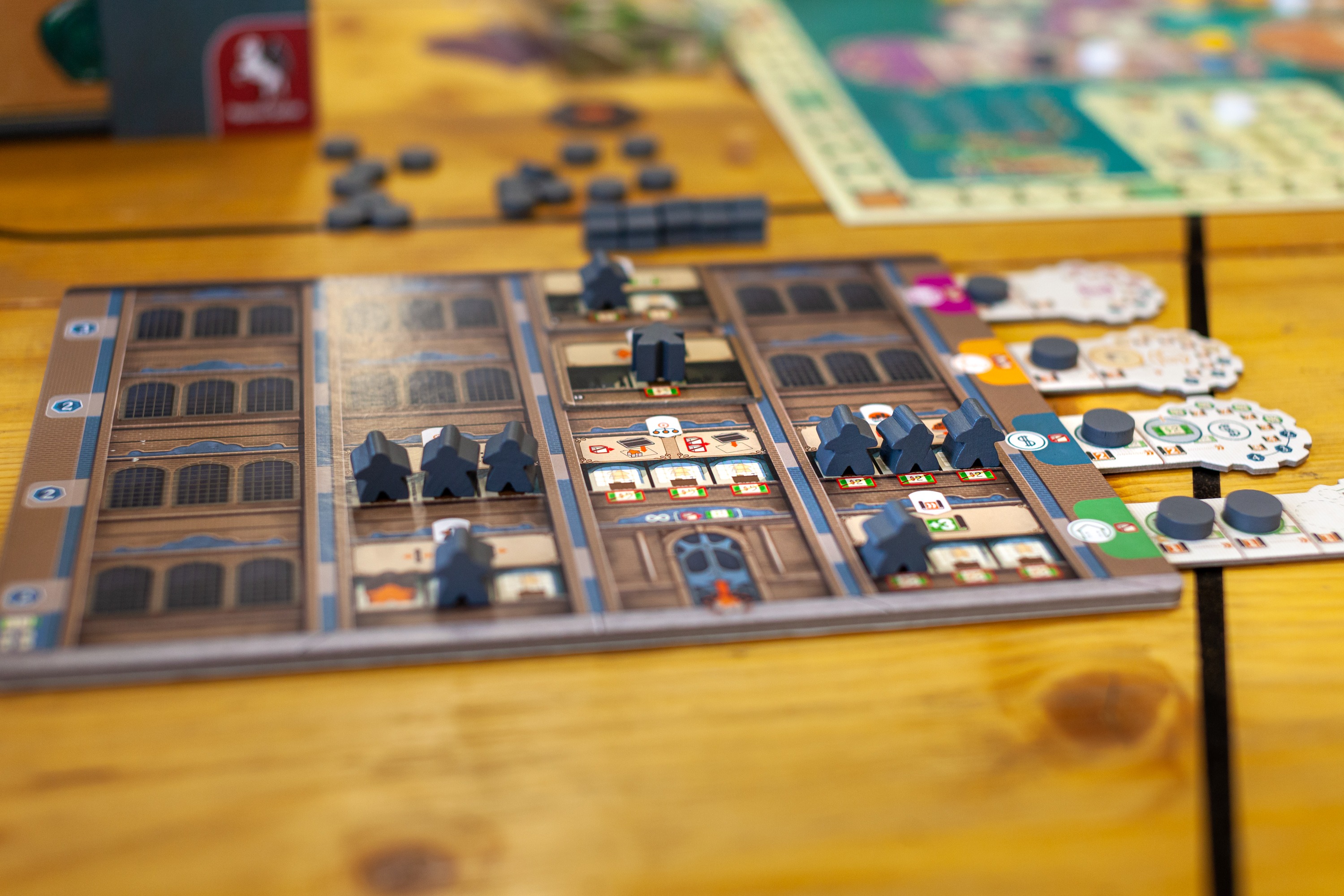 Разные типы действий активируют разные типы помещений на вашем заводе. Если там есть обученные сотрудники - они работают и выполняют это действие. Можно докупать новые помещения с более навороченным функционалом и получать больше профита. Но вся соль в том, что количество действий каждого типа на партию ограничено, и при этом они являются общими. Основной игрок выбирает какое действие все делают и все делают его по кругу. И вот тут начинается самая мякотка, значит, есть 2 стула: