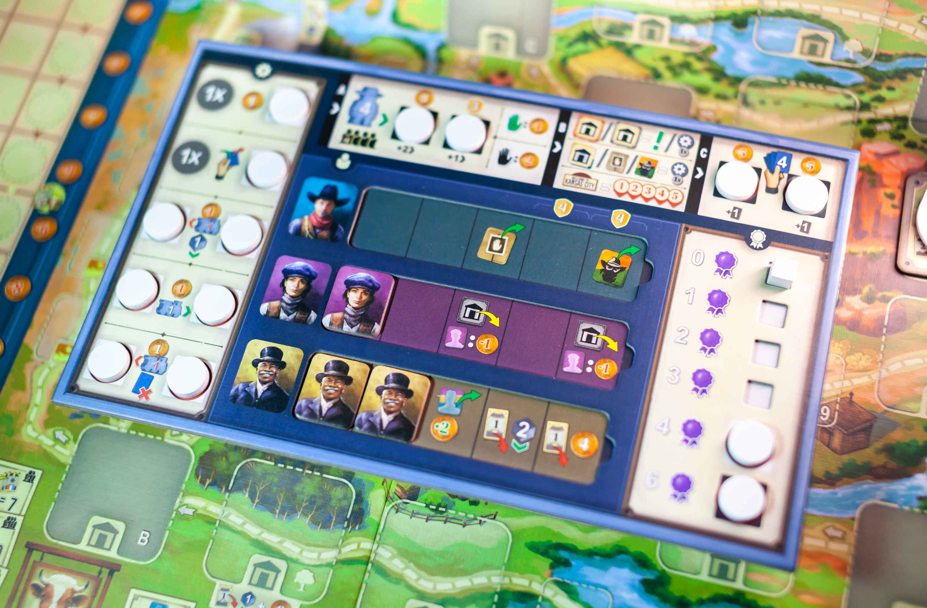 Потом возвращаетесь к началу пути. На маршруте этом каждый игрок может пристраивать разные свои лакации, которые приносят профит только ему. Иногда меняется ситуация на диком западе: появляются бандиты и всякие неприятности, которые мешают или помогают вам на пути. И вот так вы сходите примерно по 7 раз с коровами на пару. В процессе вы прокачиваете свой планшет, который дает дополнительные действия, больше карт на руку и другие плюхи. Работает приятно.