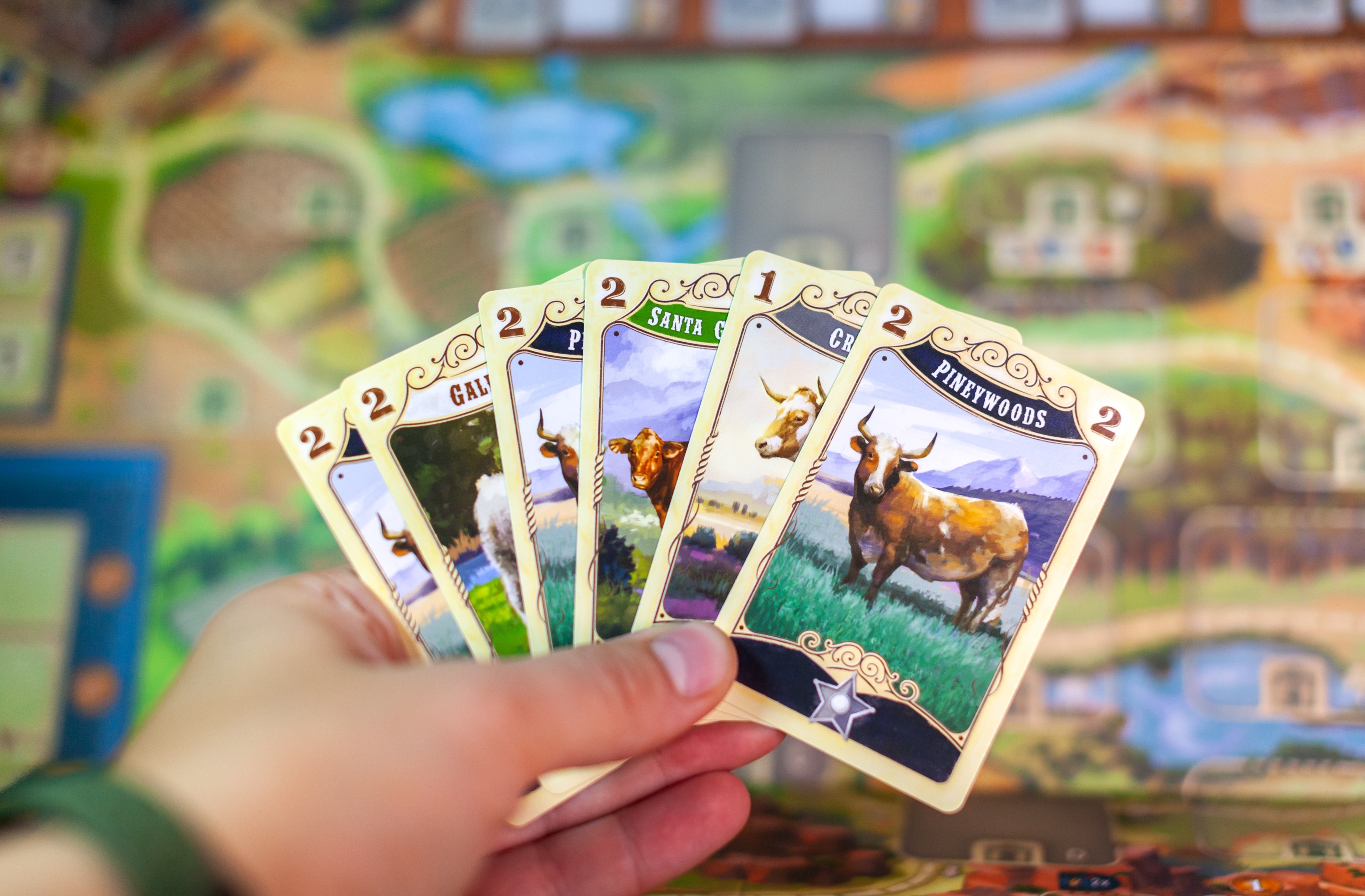Вы бегаете по дикому западу в направлении Канзас-Сити. Маршрут состоит из ряда базовых локаций по которым вы двигаетесь в рамках дальности своего хода. Каждая локация предлагает вам набор действий. Когда вы останавливаетесь и ставите туда своего мипла, то делете что нарисовано, если ресурсы позволяют. Ситуация зависит от карт скота на руке, исходя из чего вы и планируете свои действия. В конце приходите в Канзас-Сити, смотрите сколько у вас ценность разных видов коров на руках, получаете деньги и везете стадо в определенный город.