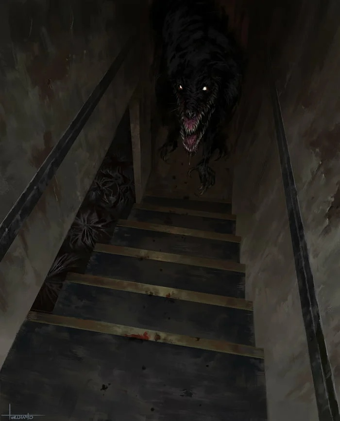 Сделав пару шагов вперёд, меня остановило нечто! Я увидел, как в дальнем тёмном углу погреба, засветились два ярко-красных огонька: «Что это такое? Что это может быть?» - я встал как вкопанный и начал смотреть, пытаясь понять, от чего исходит этот непонятный свет. Огни располагались так, словно глаза какого-то демона. Как только сделал ещё шаг вперёд, то услышал тихое рычание. Знаете, когда собака ест, а со спины к ней подходишь, то она так же делает, не громко. Затаив дыхание, я подождал ещё чуть-чуть: «Блин, это реально собака?» - начал рассуждать. Попятившись назад, я запнулся, от чего с грохотом упал. Это словно послужило сигналом для этого существа. Оно зарычало с такой силой, от чего в груди появилось такое ощущение, что моё сердце вот-вот разорвётся от страха. Я бросился бежать к лестнице.