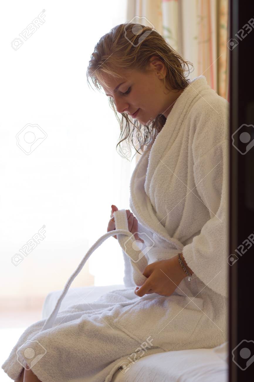 Ragazza bionda che posa nel bagno con accappatoio | Foto Premium