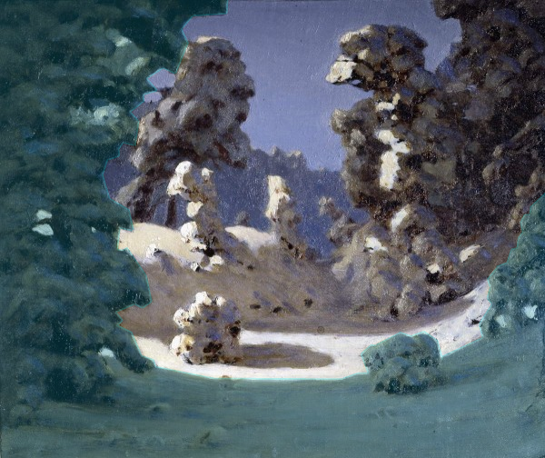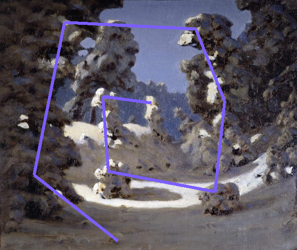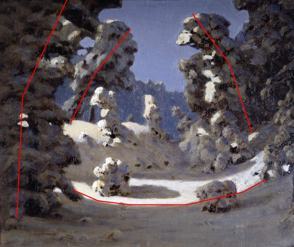 Можно сразу обратить внимание на разбитие теней в планах - сравните тени переднего плана, на котором у нас куст и большое дерево, с тенями на среднем плане - тень холма намного светлее передних теней, во-первых, потому что отражает падающий на снег свет, а во-вторых, потому что второй план дальше от нас, а значит между нашим глазом и ним больше воздуха - воздушная перспектива.