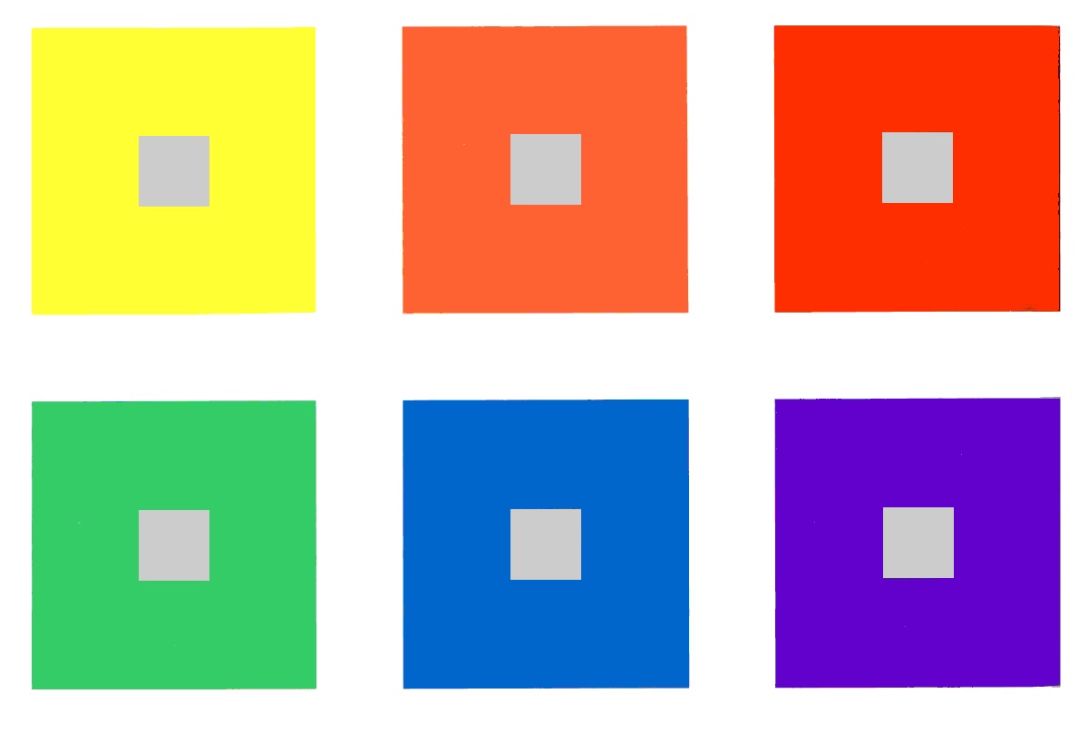 Симультанный контраст - это явление, при котором более серый, ненасыщенный цвет, кажется комплиментарными по отношению к рядом стоящему цвету, то есть если более насыщенный - теплый то серый рядом с ним - холодный, или если более насыщенный - холодный, то серый рядом с ним - теплый.