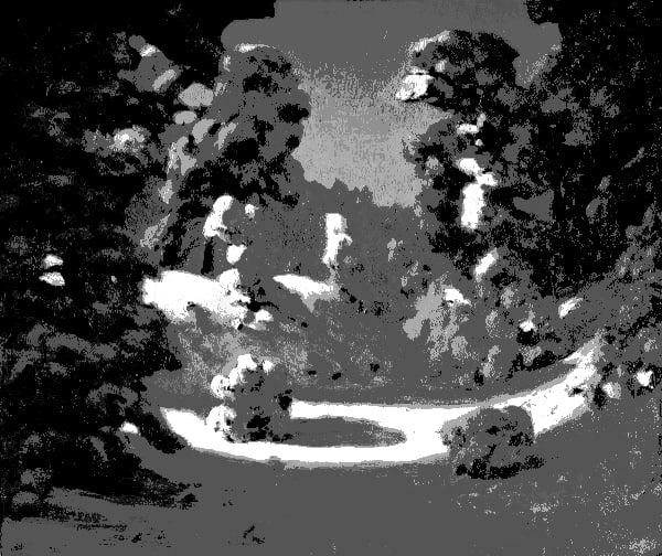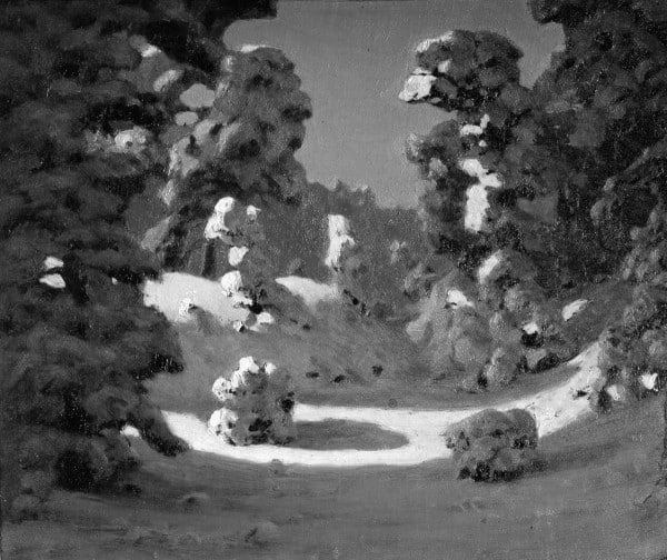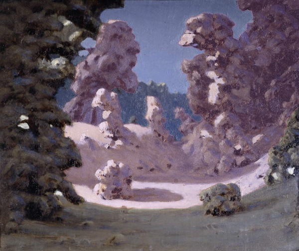 Массы деревьев более шумные по сравнению со всем остальным и более темные, они создают сгущающее ощущение. Их силуэты напоминают пещерные своды, они как бы сводятся к точке света, окутывают и сохраняют оставшуюся тьму.