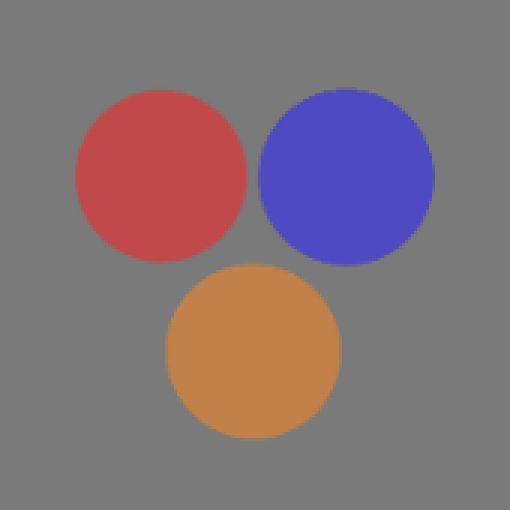 А теперь покрасим три круга в разные цвета, два из них красный и оранжевый - более близки друг другу, более похожи, синий же более комплементарен и красному и оранжевому, поэтому станет акцентным, главным.