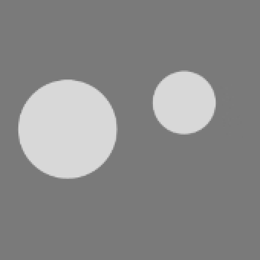 Попробуем немного уменьшить правый круг и расположить немного выше - получим целых два новых отношения - отношение пропорций и отношений расположения на холсте. Теперь главным отношением данной работы становится неравенство объемов в их размерах, мы сравниваем между собой два круга. Если выбирать центральный элемент работы, то я думаю, что правый круг для этого хорошо подходит, левый выступает фоном и своим размером больше приближен к размеру фона. До этого нас не интересовало как относительно холста расположены объекты, теперь же мы получили новое ощущение, новую связь, оказалось что нам важно как объекты существуют друг относительно друга и относительно холста. Создается восходящая диагональная динамика. За счет того, что правый круг выше мы получаем эффект расстояния. Т.к. к центру ни один из них не ближе, то думаю главным элементом здесь так же является их связь, то есть расстояние.
