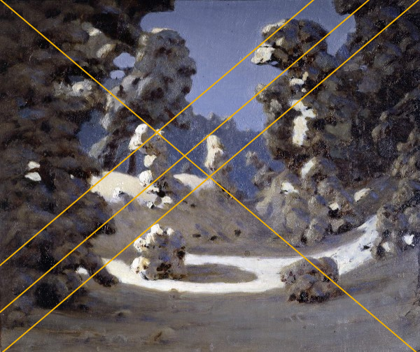 Сами объекты гармонично уравновешены на работе, дополнительно они взвешиваются за счет различных элементов, например пятна света на дереве или темного куста, контрастирующего со снежной плоскостью.