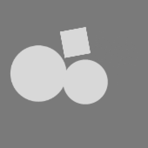 Немного изменим пространство. Теперь у нас есть два круга, которые соприкасаются друг с другом - сращиваются и образуют групповое пятно в прямом смысле. Отдельно от них находится квадрат, который контрастирует с ними своей угловатой формой и расстоянием от них. Круги здесь образуют отдельную группу, которая подчеркивает отдельность этого квадрата - это про одиночество...