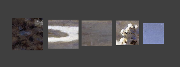 Пятна входа в работу это тоже важная часть картины, через пятна мы начинаем обследовать работу, то есть края работы обычно начинаются с каких-то относительно больших масс, которые служат для того, чтобы дать контекст, с помощью них по силуэтам мы начинаем скользить глазами к центру работы. Массы деревьев здесь самые темные и достаточно шумные.