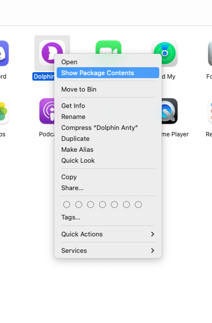 Переходим в папку с приложениями и находим там наш Dolphin Anty, нажимаем на иконку правой кнопкой мыши "Show package contents".