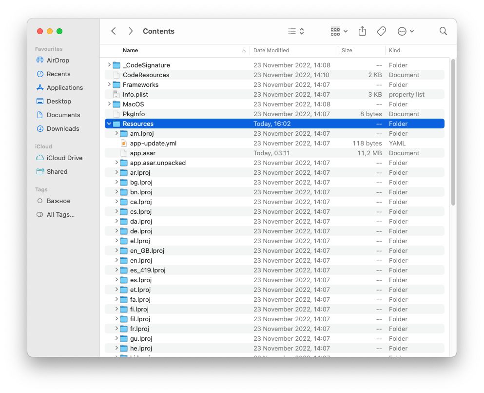 Далее смотрит ресурсы прилы и видим в папке "Resources" файл app.asar тот самый что мы взяли с https://github.com/yagiraa/dolphin-free жмакаем 2 раза на папку Resources что бы файл не попал не туда куда надо :)