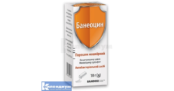 Банеоцин® Международное непатентованное название Нет Лекарственная форма Порошок для наружного применения, 250 МЕ + 5000 МЕ/1 г Состав 1 г порошка содержит активные вещества: бацитрацин цинк 0 .0041667 г (соответствует 250 МЕ) + 10 % избыток 0 .0004166 г, неомицин сульфат 0 .0074626 г (соответствует 5000 МЕ) + 10 % избыток 0 .0007462 г .