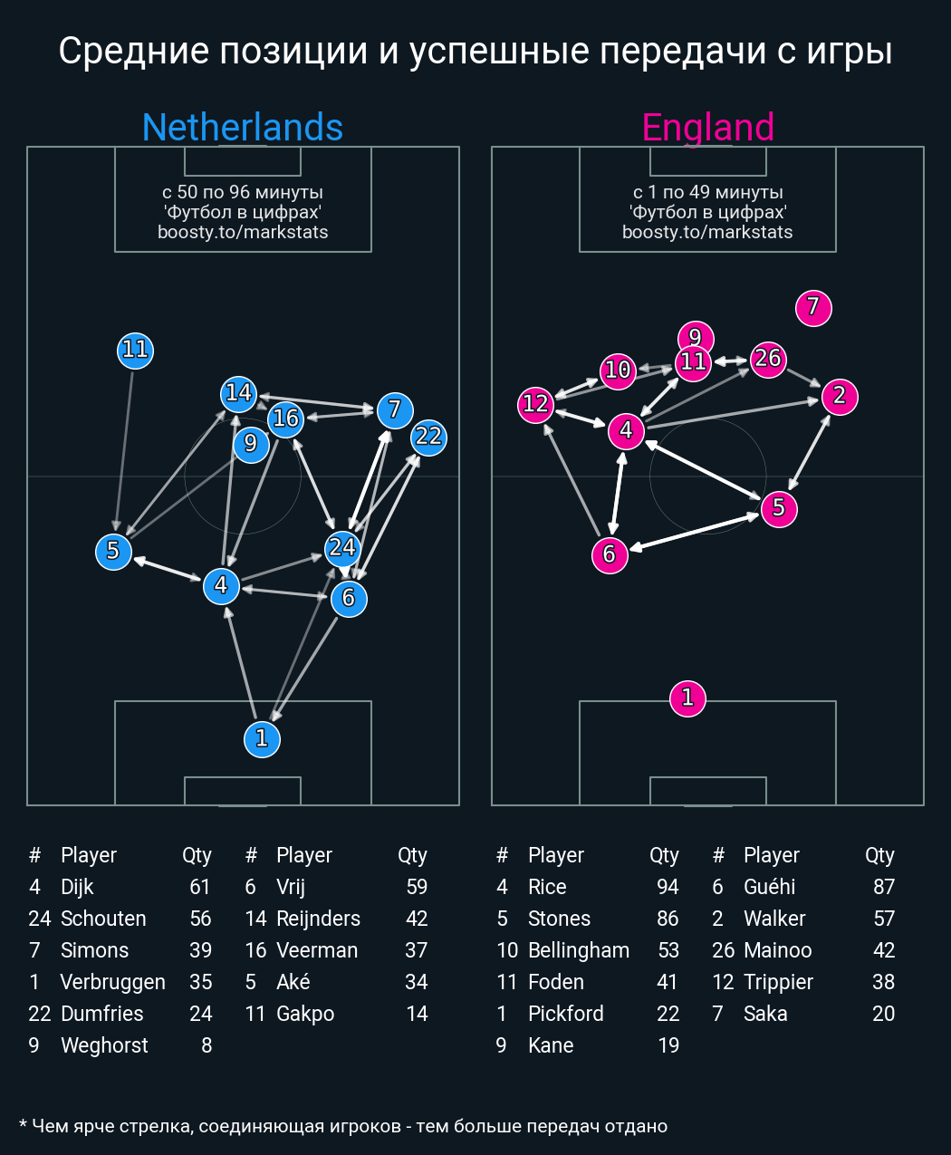 15 успешных передач из 20 попыток (1 под удар, 4 с продвижением, 10 на трети соперника)
