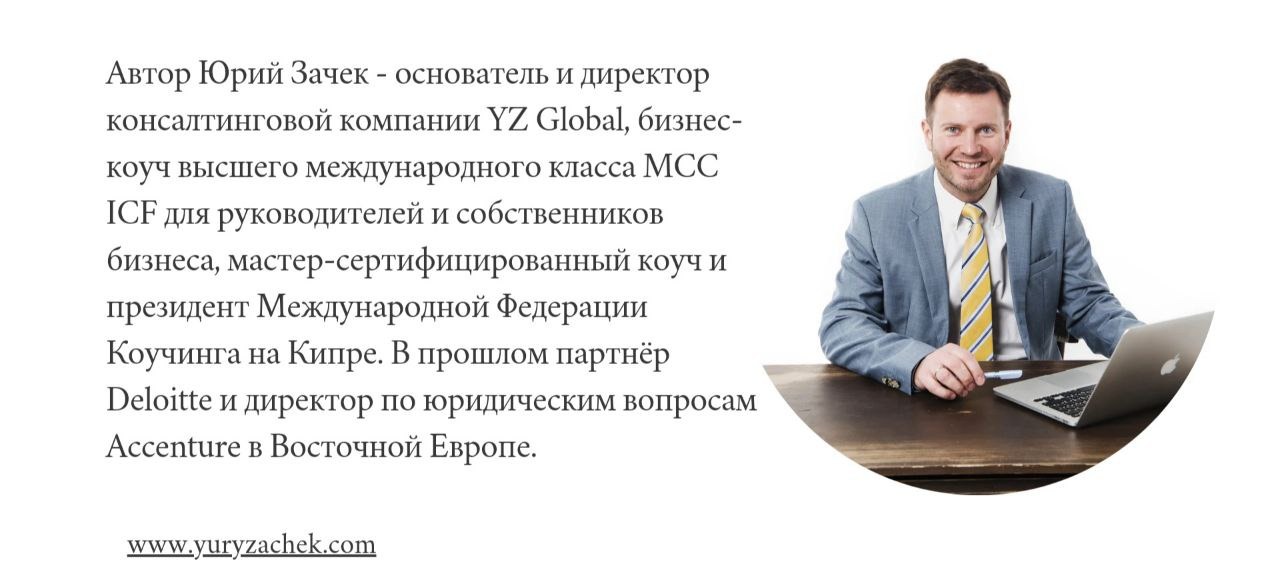 Автор Юрий Зачек - основатель и директор консалтинговой компании YZ Global, бизнес-коуч высшего международного класса MCC ICF для руководителей и собственников бизнеса, мастер-сертифицированный коуч и президент Международной Федерации Коучинга на Кипре. В прошлом партнёр Deloitte и директор по юридическим вопросам Accenture в Восточной Европе.