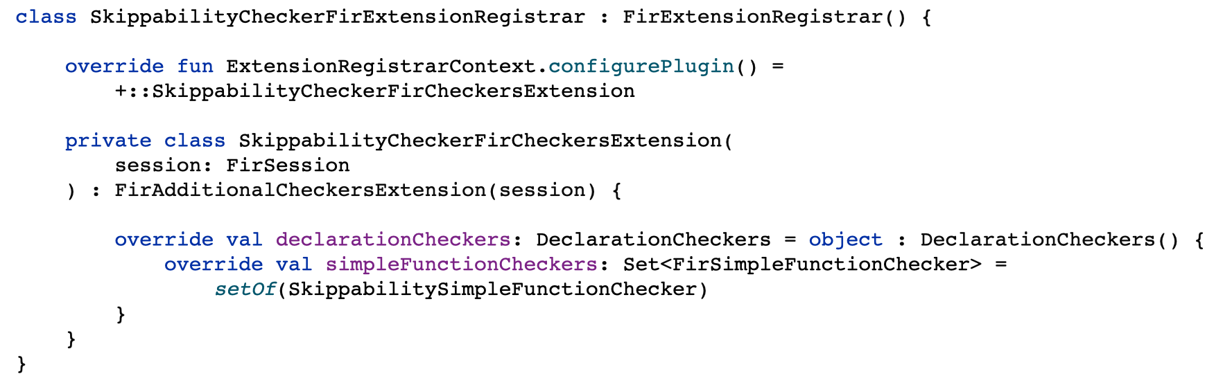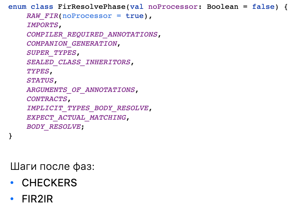 - Первое и самое важное - это то, что он работает в несколько этапов. И на каждой фазе резолвится только часть синтаксического дерева. А у нас плагин будет работать на этапе Checkers, на котором все фазы выполнены и FIR дерево полностью зарезолвлено, что скорееупрощает нам работу, так как на других фазах декларации могут быть не сформированы и обращение кним может вернуть либо null, либо закрашить сборку.